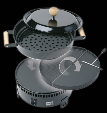 Marronipfanne und Deckel schwarz emailliert, Unterteil schwarz, pulverbeschichtet, mit 2-Stufen-Schalter geeignet für Marroni (Stufe 2) oder für die Verwendung mit der Grillplatte (Stufe 1). Gebrauchsanweisung: deutsch, englisch, französisch, italienisch, holländisch.